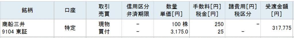 商船三井(30万円)の株を購入したときの取引履歴になります。