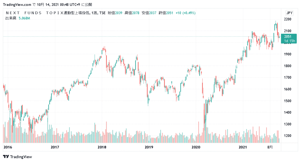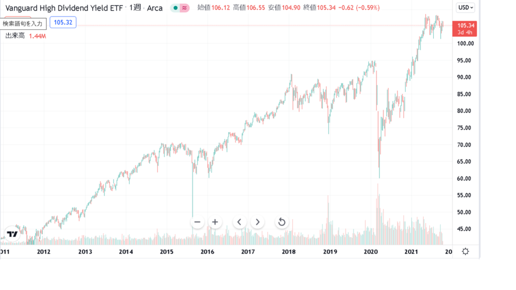 一般的に高配当の株は、値上がり率が高くない物ばかりです。そのため高配当株をたくさん集めたETF、つまり高配当ETFもどうように値上がりしにくくなっています。