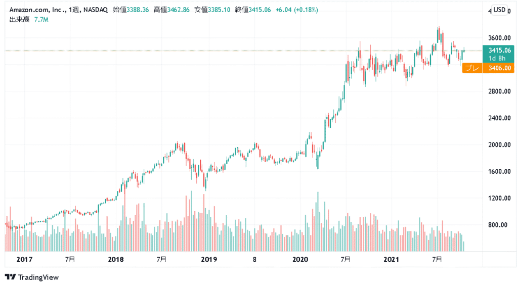 ネットショッピングで有名なアマゾンです。最大手のEコマースのサービスを提供している会社になります。