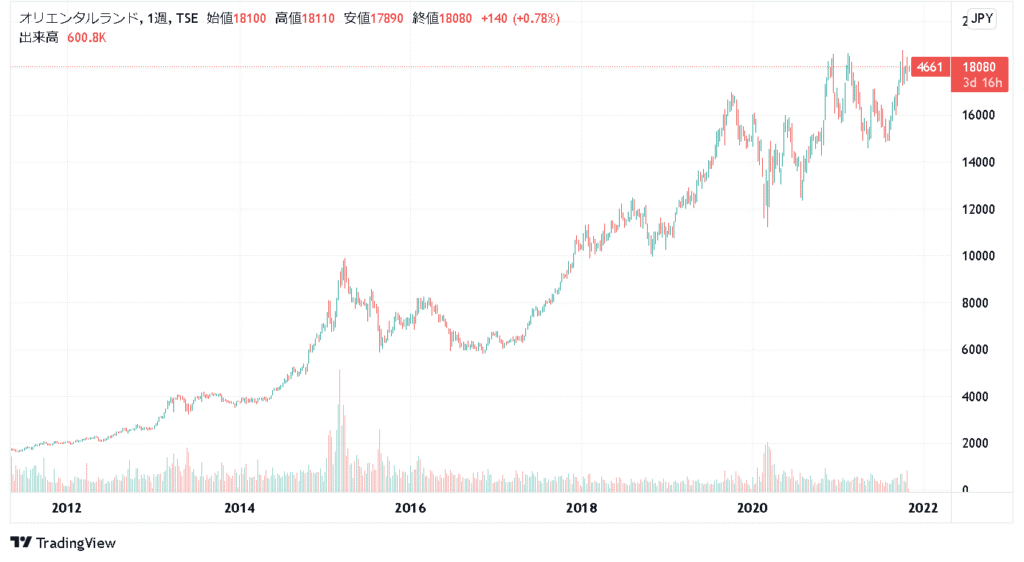 2020年新型コロナウイルスが流行したことによって、テーマパーク事業に大きな影響を与えたことによって株価も下落しました。