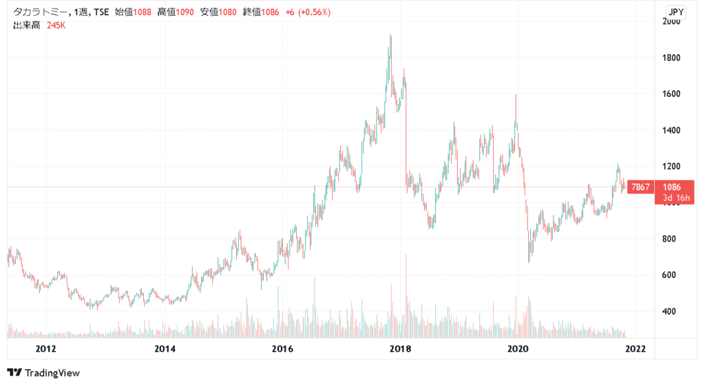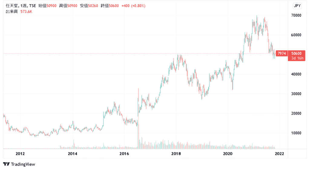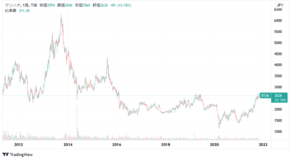 2012年から2021年までのチャートです。2013年に1株6000円の高値を記録して、そこからじりじり下がっていることが分かります( 一一)