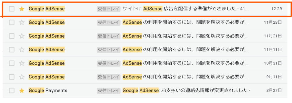 9月11日に「アドセンス」の不合格通知が届いています。トータル5回審査に落ちて6回目で合格することができました!!